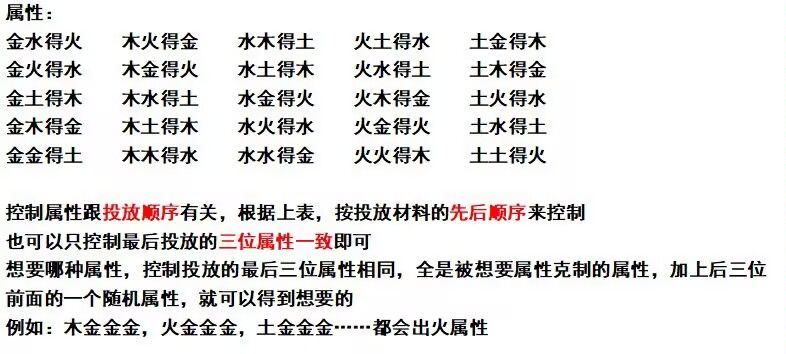 炼丹属性控制最终的丹药属性根据你最后放入的材料属性决定,假如你要炼火属性丹方,火克金最后放入三个金属性材料,同理炼制水属性,水克火最后放入三个火属性材料,炼制丹药的类型则根据一半以上的药材对应的穴位决定,如下图所示: