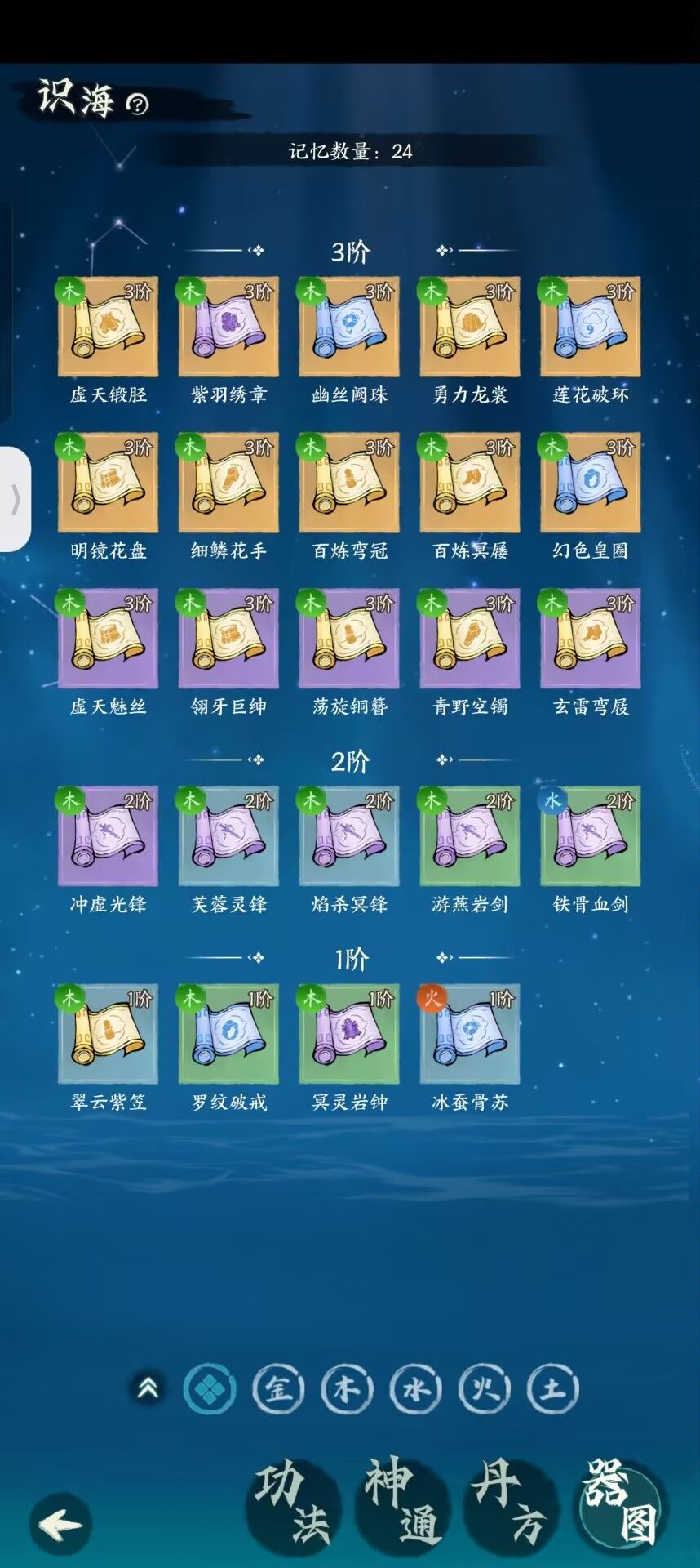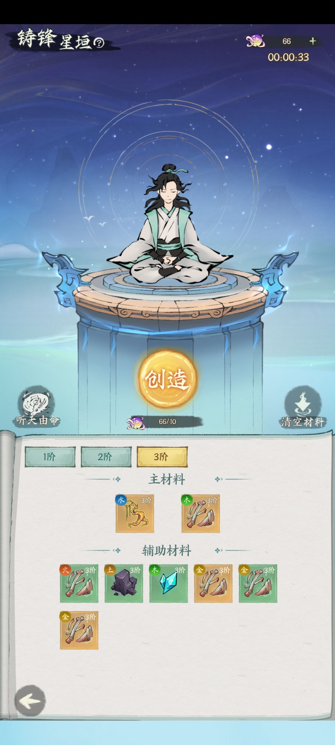 这里告诉大家一个增加出天阶图纸的小技巧,主材假如使用的是水属性,那么副主材使用相生属性,即水生木,辅材放木属性,辅助材料除了最后三个需要被克制的属性,其他材料没有什么要求,重要的点来了,为什么要求主材部分是相生的呢,因为这样可以提高出图纸的概率,没错的图纸不是天阶图纸,天阶图纸要靠最后三个被克制属性的材料控制,因此最好最后三个被克制属性放相同的材料,失败了没关系一个一个试,只要出了图纸哪怕不是天阶也说明这个材料是正常的,此时只需要不断调整且保证存在一个出了图纸的材料,将剩下两个分别尝试换成相同属性的不同材料便有很大概率出天阶,如果死活弄不出天阶图纸的情况下就改变辅材区前面那部分,主材区不动,并重新进行尝试,这个方法只能极大提高概率,不是必定出天,这里感谢白立道友的测试和调整