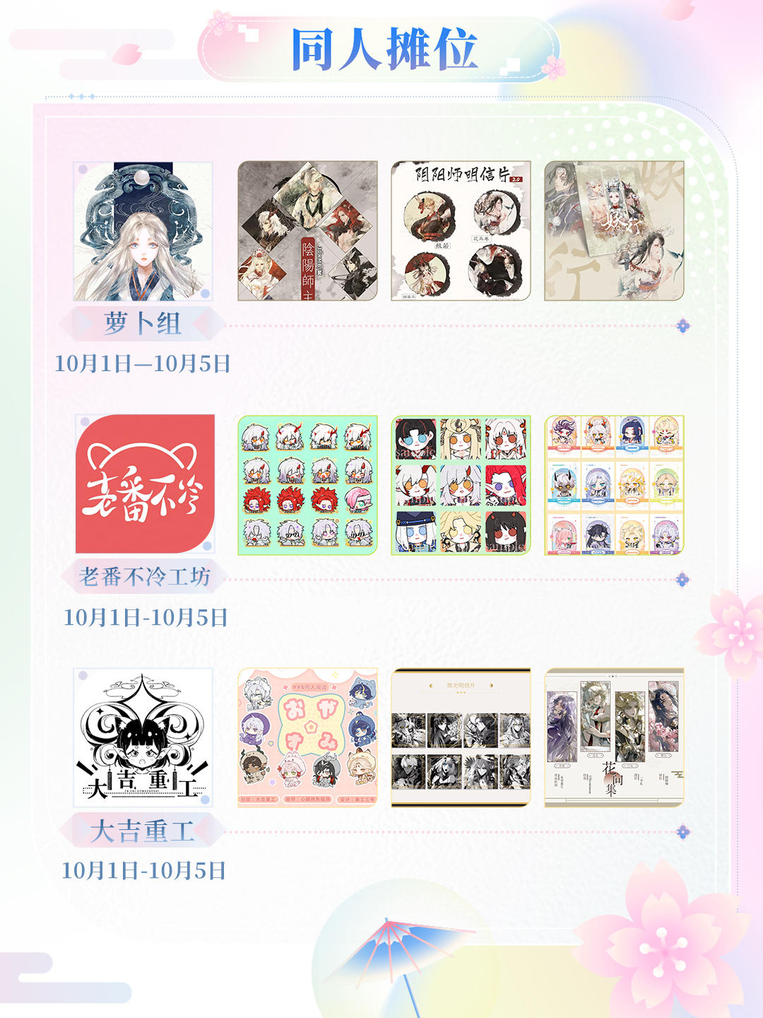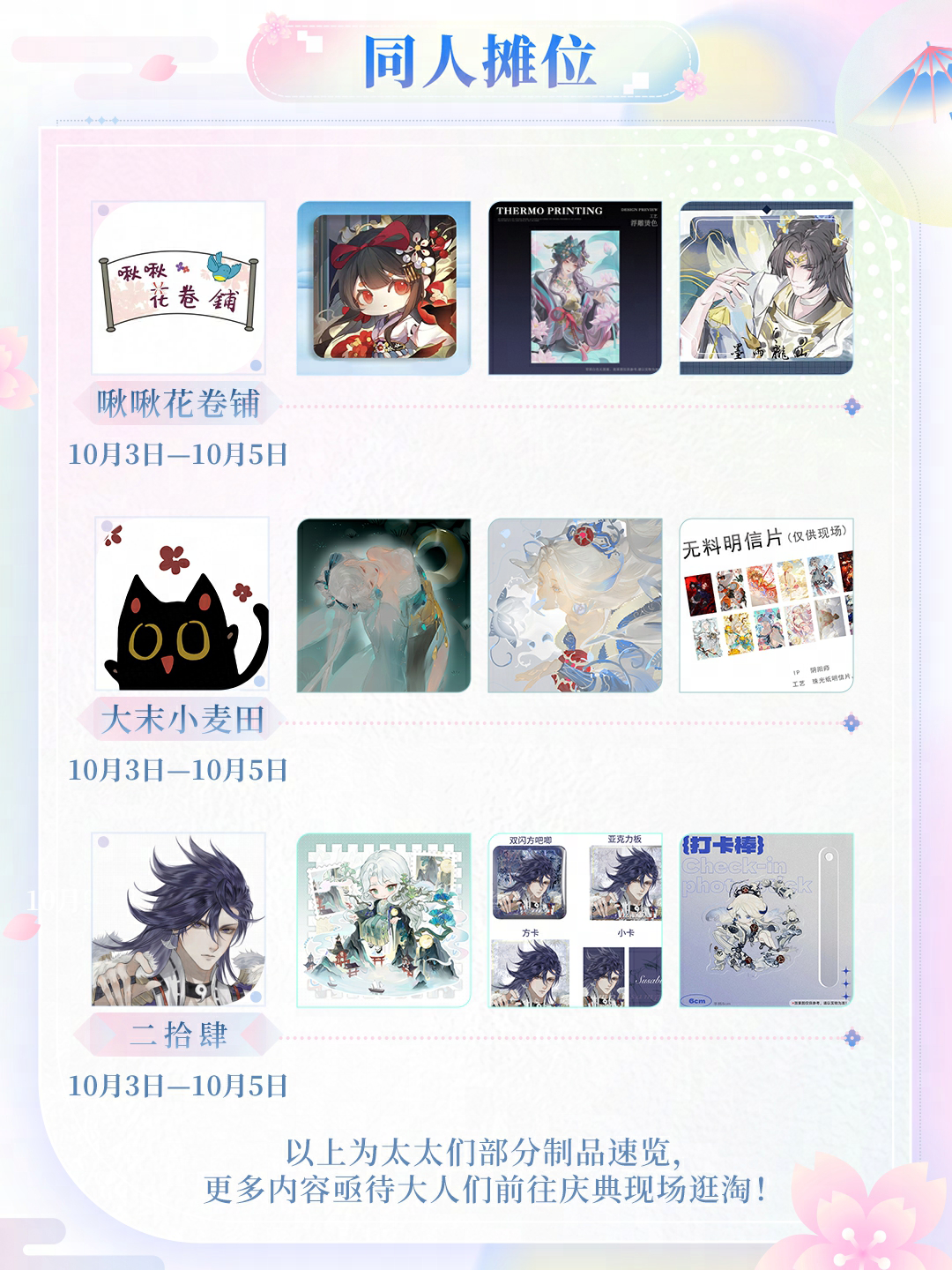 感谢所有参与同人摊位招募的阴阳师大人,【町中市集】荣幸迎来18位优秀同人摊主!神仙太太们将携精美的同人创作,与各位大人在庆典相见,共庆九周年!