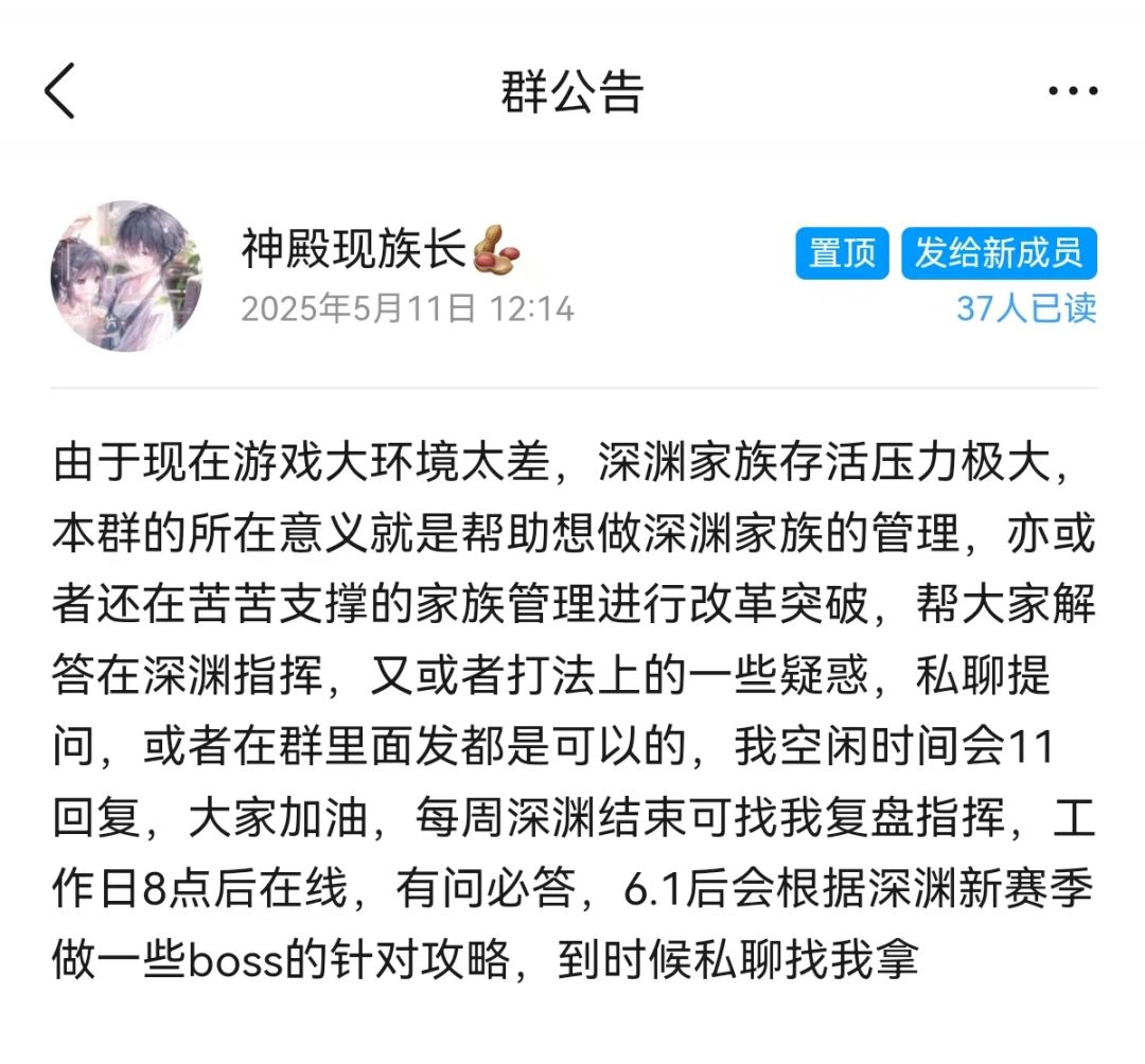 (所以对花生的敬佩更上一层楼了哈哈)。最近听说不少家族(尤其是新区)都需要一些深渊建设方面的指导,所以写下这篇帖子分享与诸位,希望提高一波广大深渊玩家的游戏体验。首先,我希望诸位明白一个道理:优秀的指挥策略需要良好的深渊制度支撑。所以,本帖子将聚焦于顶级深渊家族的基础建设与人员职位安排,希望有能力的家族能酌情效仿。至于具体的深渊打法,那又是另一个故事了~