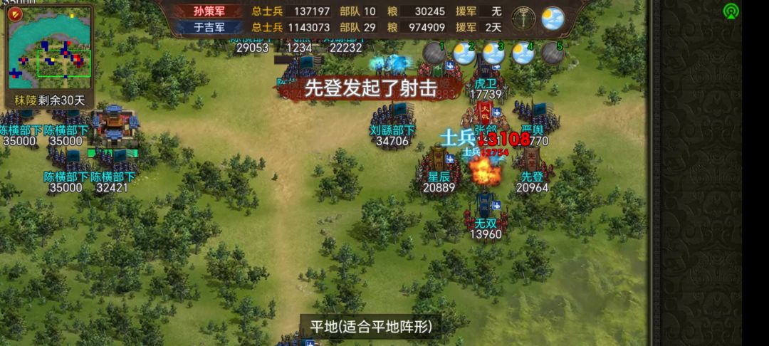 太史慈偷城当天,触发大㦸援攻,杀掉刘繇,杀完后白马走到原刘繇位置凿穿进城(图七),再连珠杀掉小兵(图八),杀完后当天会立刻刷出来严兴(不管他)和boss(图八)。大㦸走到boss旁边,无双往Boss位置靠拢准备第二天上将,二天上将火箭围殴boss一回合带走(图九)。位置不理想一天带不走没关系,一天不行两天基本配置差点也能带走了。
