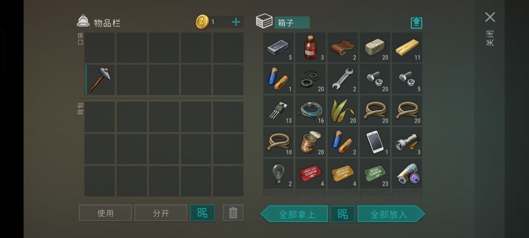 一把铁斧2把石斧,箱子里给的低耐久斧头拿去开木工台,里面有一组木头