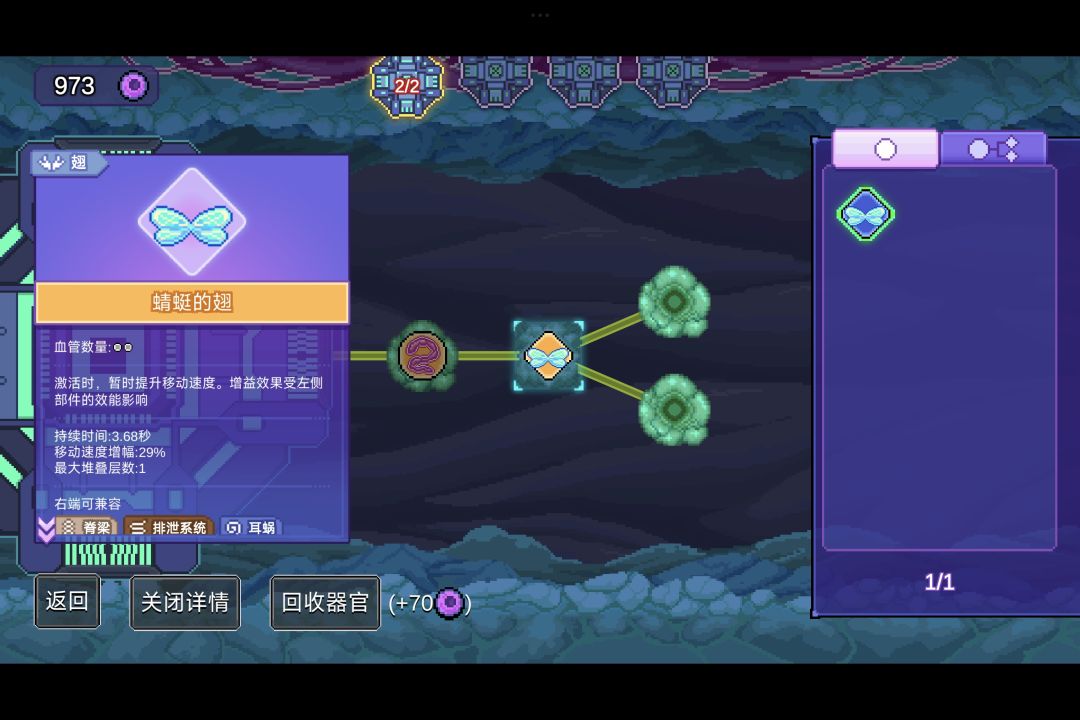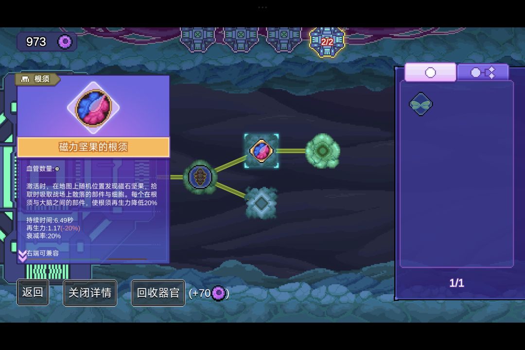 前期细胞获取比较慢,可以先点出一个大脑跟血量+1,这样就有4血4护盾。后面适当的刷一刷部件,掉血掉护盾选择其中一个成型基本就稳了
