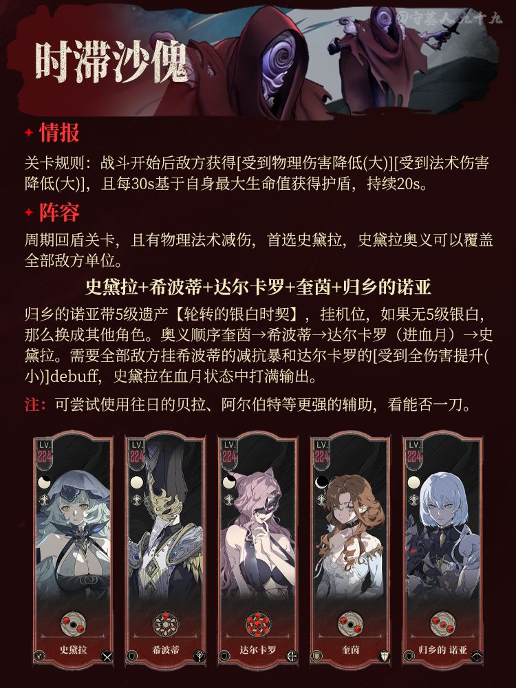 第4第5关限制终苍发挥,终苍分配给123,DOT或范海辛分配给45。 有5级银白时契遗产的玩家,可以上贝拉或归乡的诺亚挂机,提升队伍的魂髓。