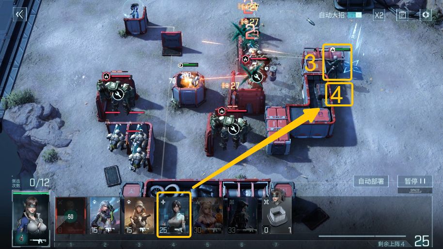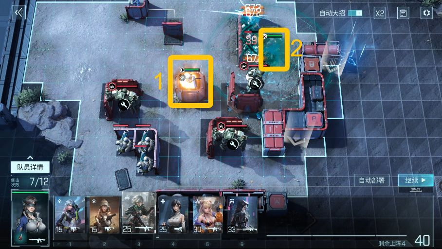 按照图示依次上阵【留声】(1)、【克洛伊】(2),留声负责承伤,克洛伊侧击右边boss和小兵