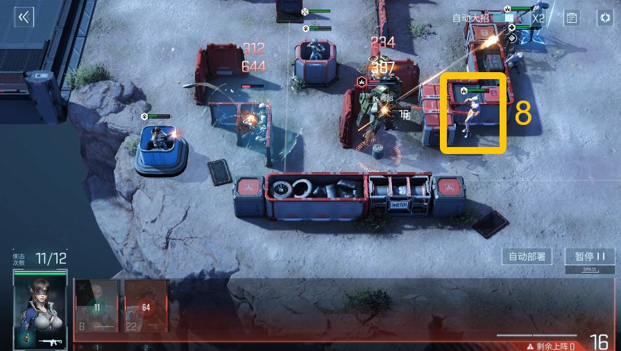 在图示位置依次上阵【赛卡卡】(6)、【抽到的ssr/助战的突击】(7),赛卡卡上阵击破左边boss最后一个弱点,另一个突击队员负责扛伤