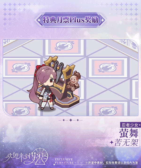 -核心奖励内容:解锁乐园月票进阶奖励、萤舞[忍者少女]心绪时光·雨后紫阳、萤舞[忍者少女]专属互动家具「苦无架」