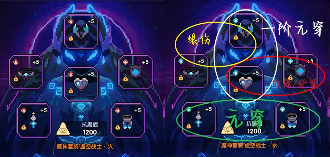 (ps.推荐如左图所示,携带一套二阶火系外装。属性挑选参考右图,红圈部分优先选择护穿。副属性洗练可选爆伤、火攻、护穿。)