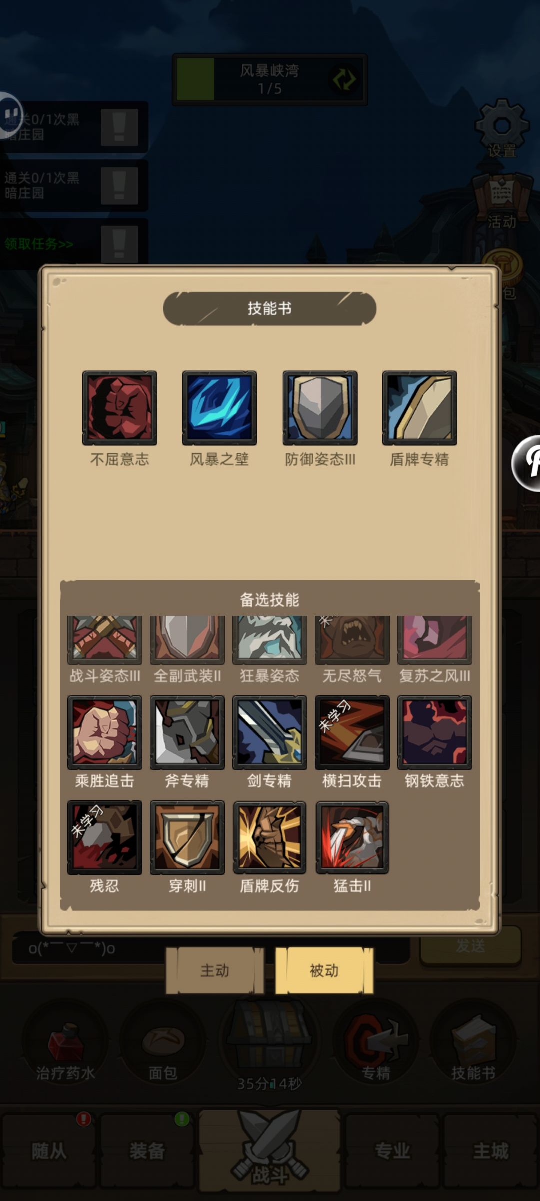 如果前期保证自己不死的话 用不屈意志 风暴之壁 防御姿态 (3级) 第四个可以用复苏之风(极限苟活)或者如果感觉压力不大 可以用穿刺 或者盾反 或者狂暴姿态 看自己的实际情况
