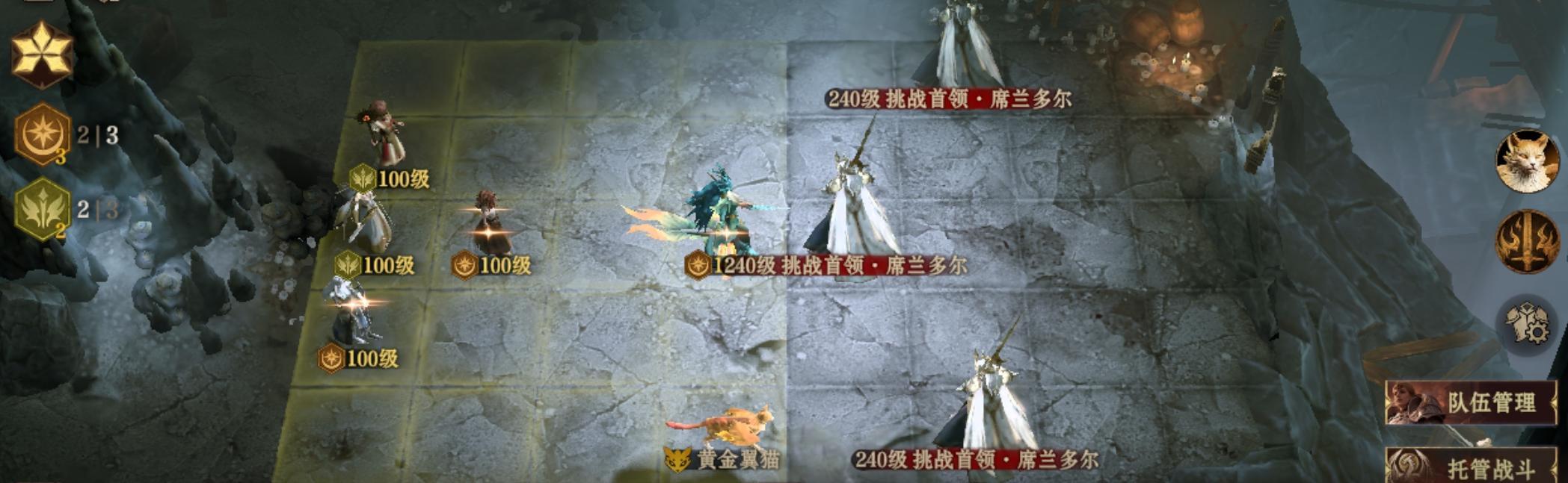 因为前2个技能范围只有2格,所以我们可以采取1前排凸前站位拉住3只boss,其他远程在后排集中站位,这样子,前2个技能只会打到前排。