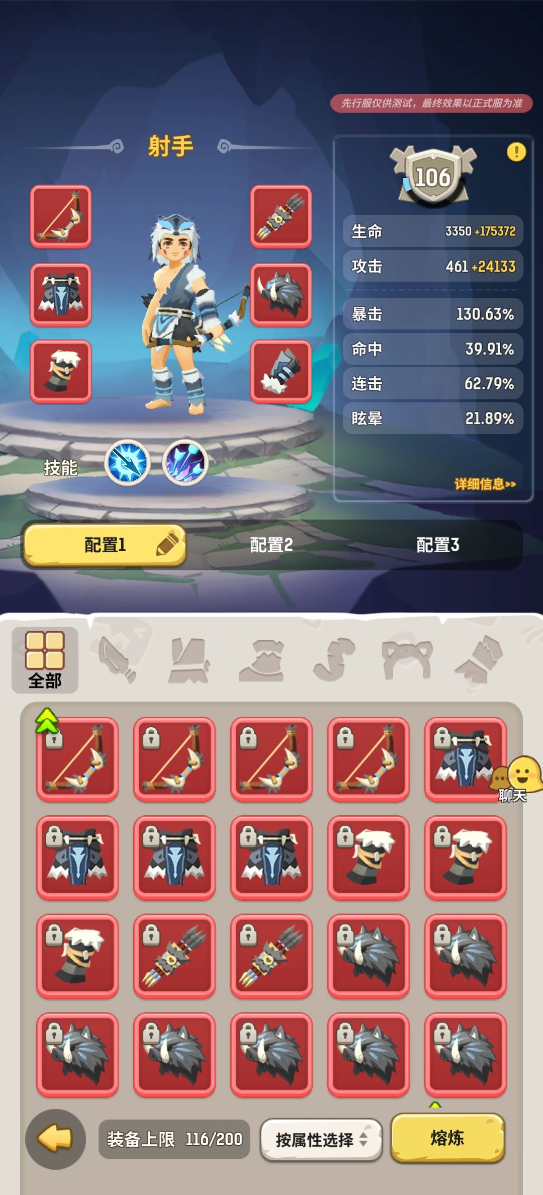 熔炼装备可以获得熔炼经验,获得基础属性的大量百分比加成熔炼建议熔炼所有非最高等级装备,最高等级的锁住需要用的,其余基本可以熔炼,后期红色不建议熔炼,除非有两个重复的。