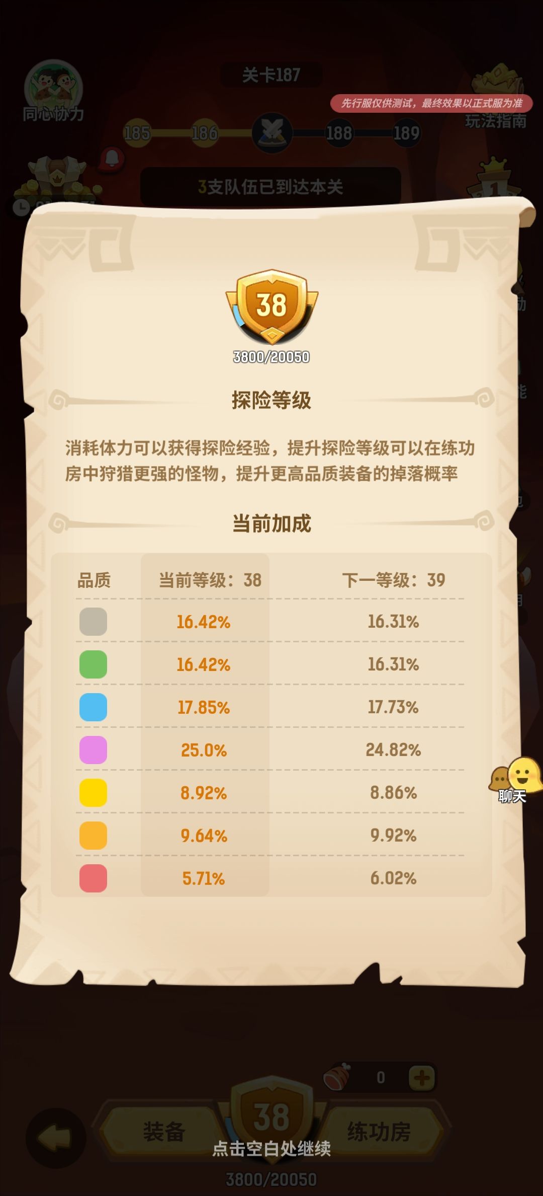 探险经验的提高会使得高品质装备爆率提高,29级以后会有概率直接获得红色,冲刺阶段,达到24级以上,依靠8.0%的提升装备等级,有概率获得红色。