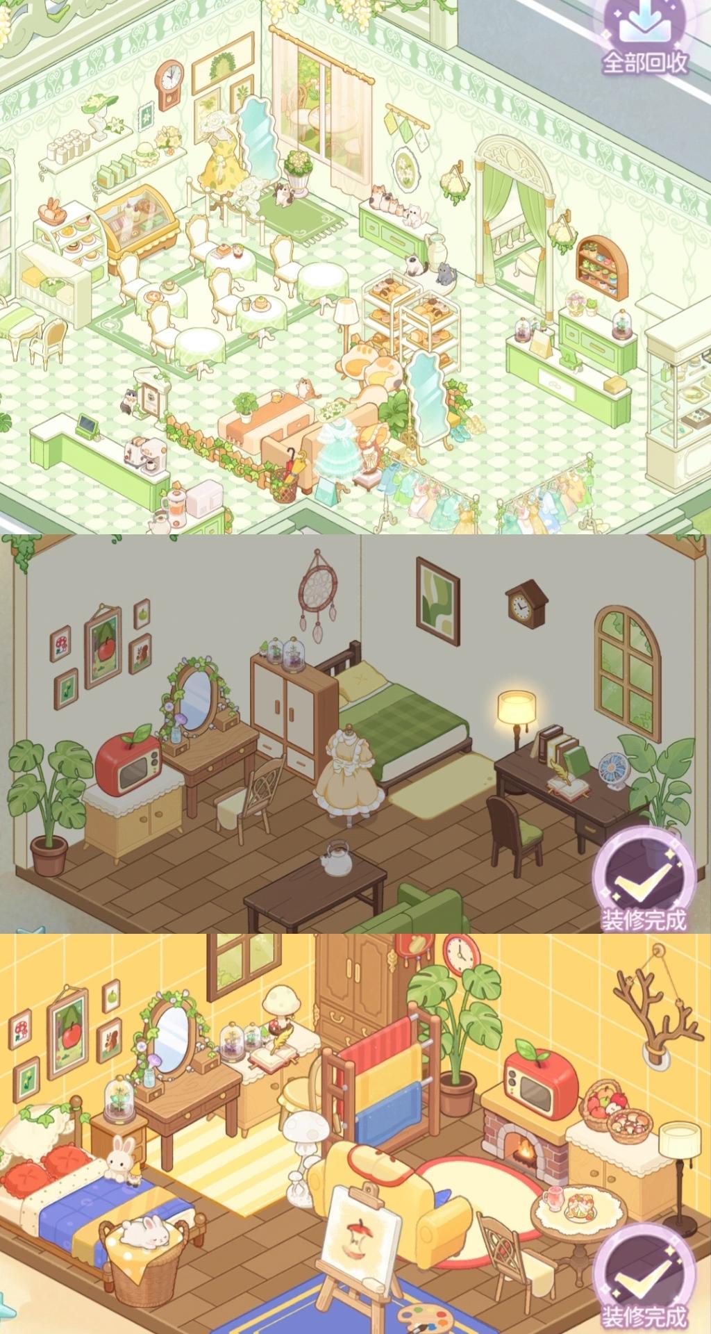 第六关于装修的,家具叠加经常出bug,有时候卡着卡着bug就没了。还有点击家具就可以移动这点不太好,很容易误点,然后家具飘了。最好换成点击→移动→确定,三个步骤,固定家具这里面只有一个整体确定,非常不方便。最后家具画风还不错,我个人挺喜欢的