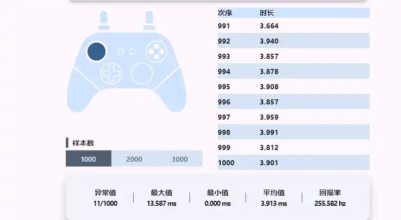 让我们将目光转向X5s,由于他是今天的主角,那我们必须循序渐进的来,让我们先来测试一下他有线连接能不能连接到电脑,结果也是出人意料,居然真的可以连接。那么机不可失,我们先给他做一下全身测试。首先是回报率测试,笔者通过反复测试,统计出这款手柄的回报率平均值为255Hz,关于回报率方面,其实大多数人都有一个小误区,但是机制有点复杂,笔者就先不在这里展开过多的解释了,简单来说就是目前市面上大多数1kHz回报率的手柄实际延迟其实远没有达到1000赫兹回报率应有的1ms,对于大多数人而言,200Hz左右的延迟就已经很难让人察觉到了。
