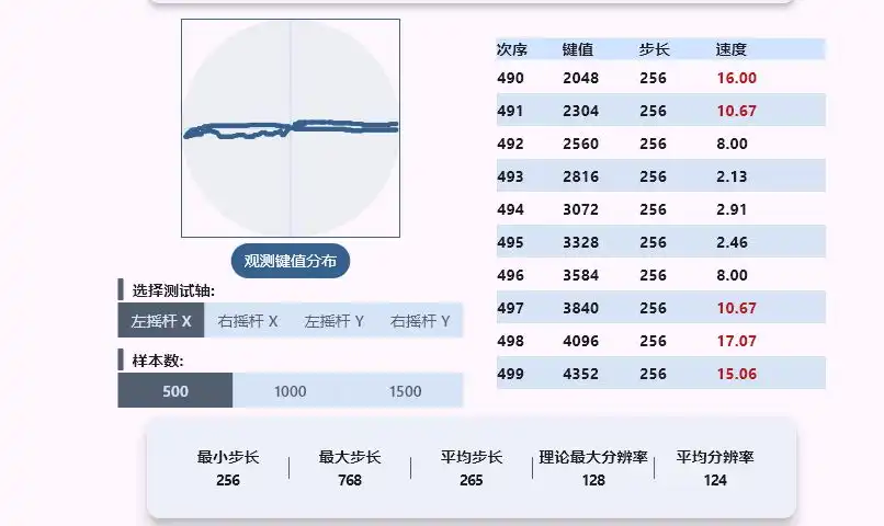其次是分辨率测试,虽然平均分辨率大约在120左右,但是键值分布非常均匀,这也意味着这款手柄的摇杆稳定性非常强,只能说不愧是霍尔摇杆,让小鸡把性能调教的是真的优秀。