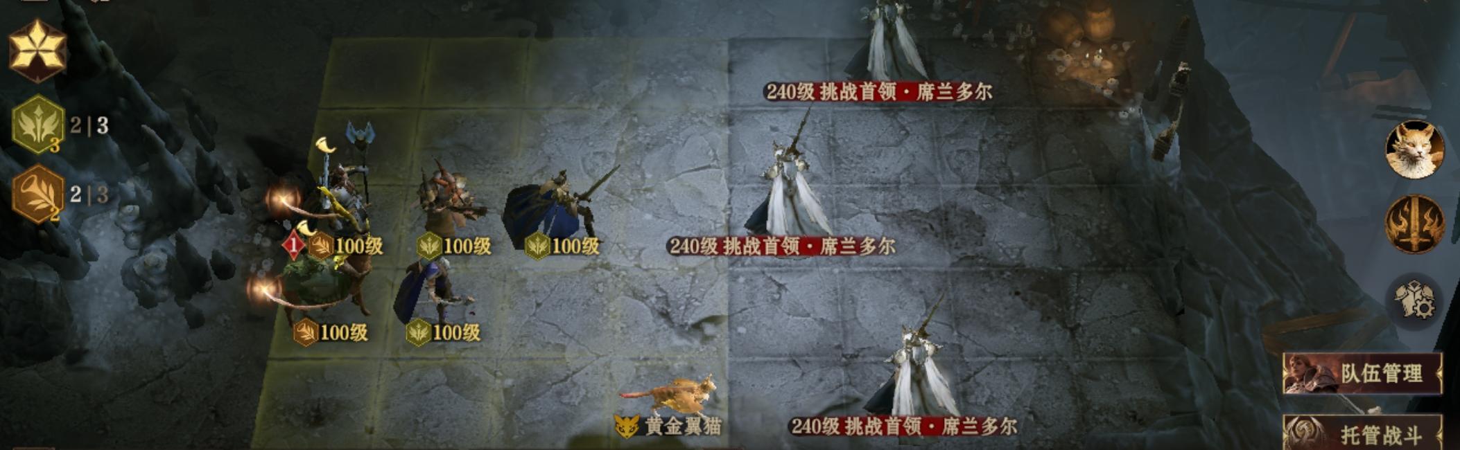 因为前2个技能范围只有2格,所以我们可以采取1前排凸前站位拉住3只boss,其他远程在后排集中站位,这样子,前2个技能只会打到前排。