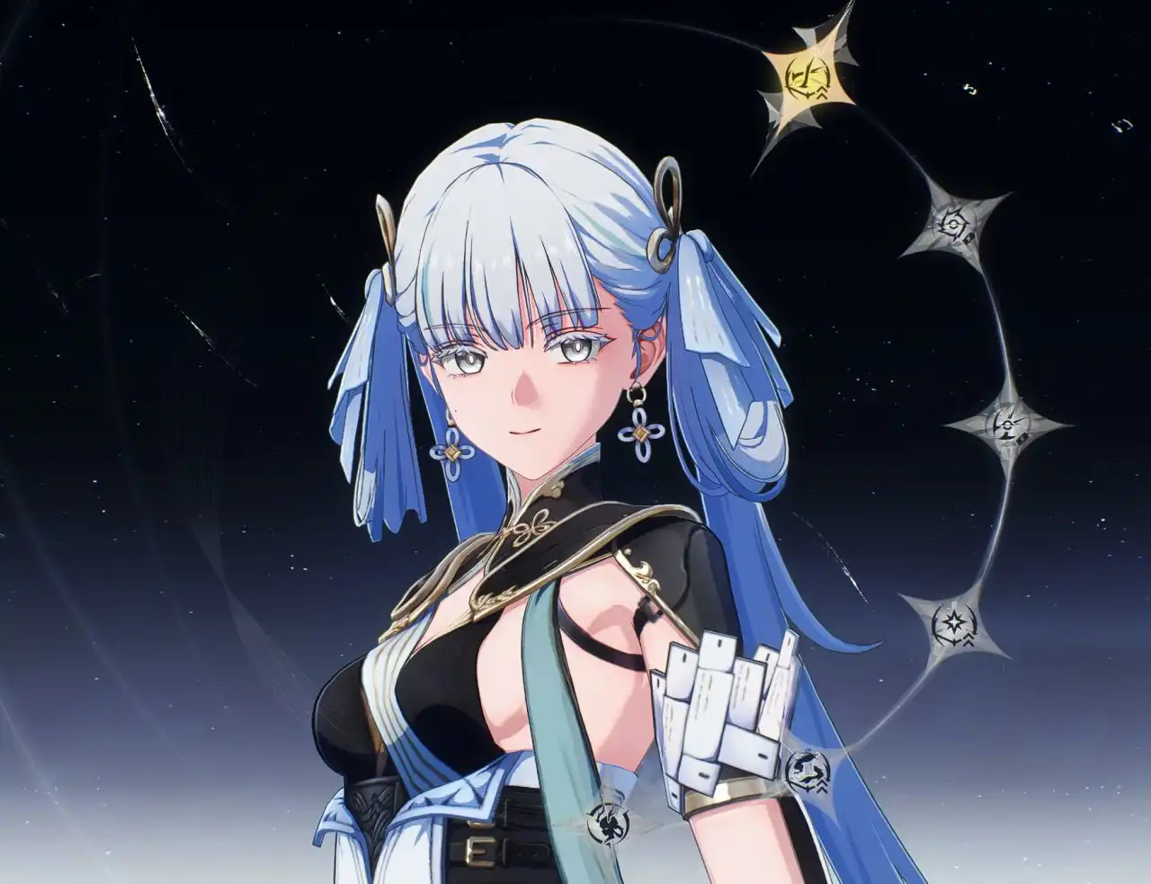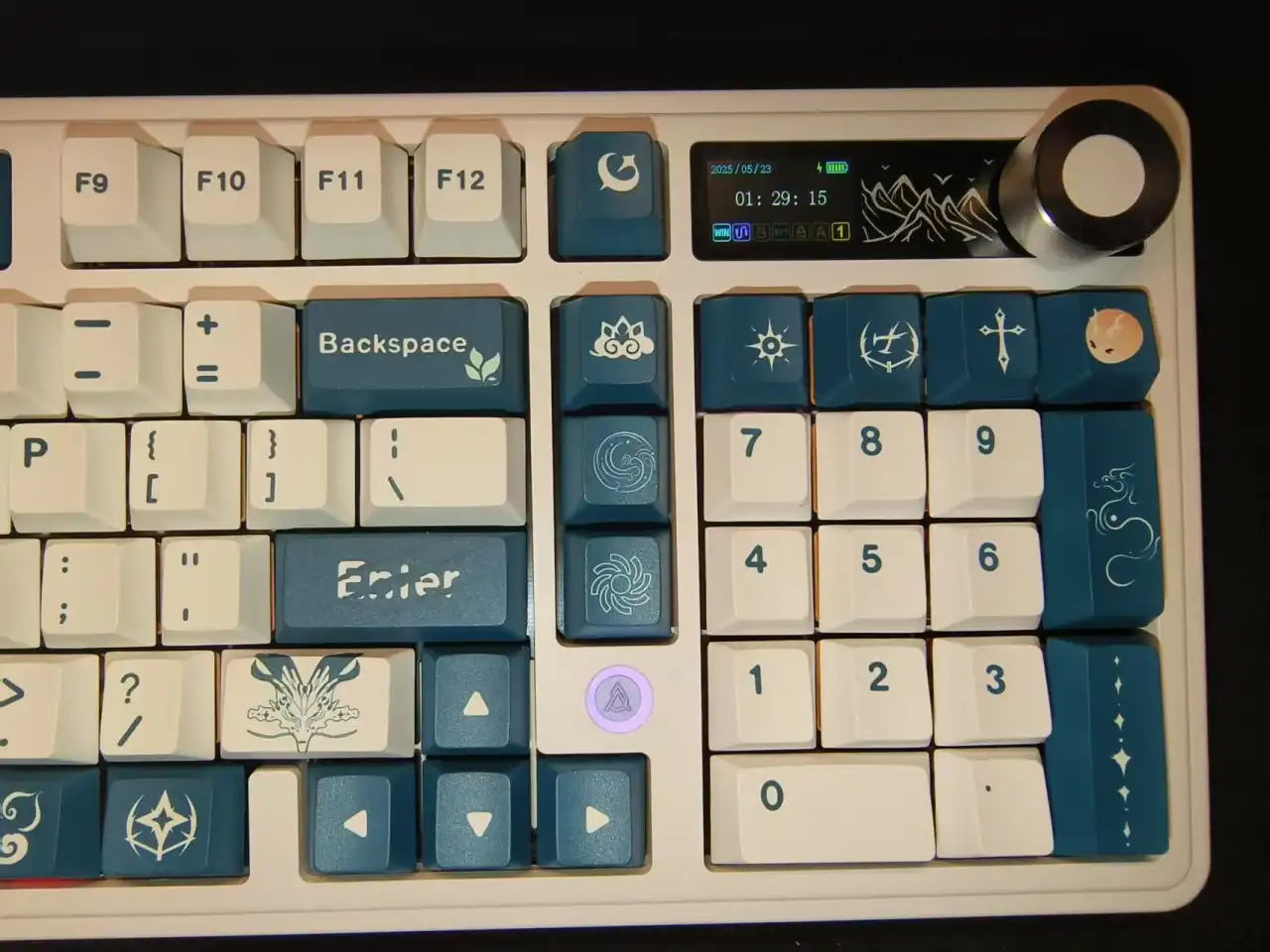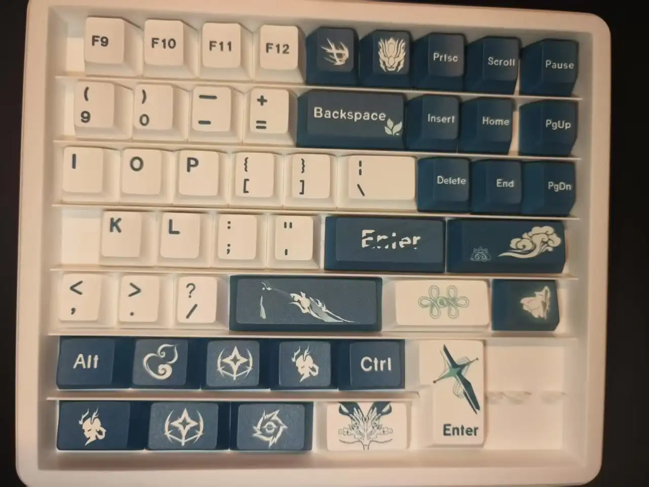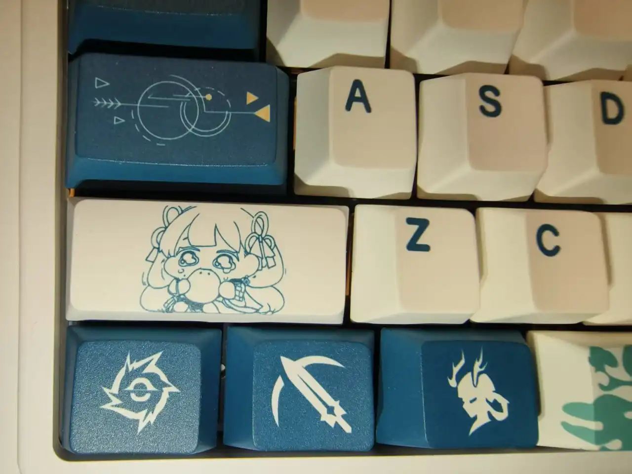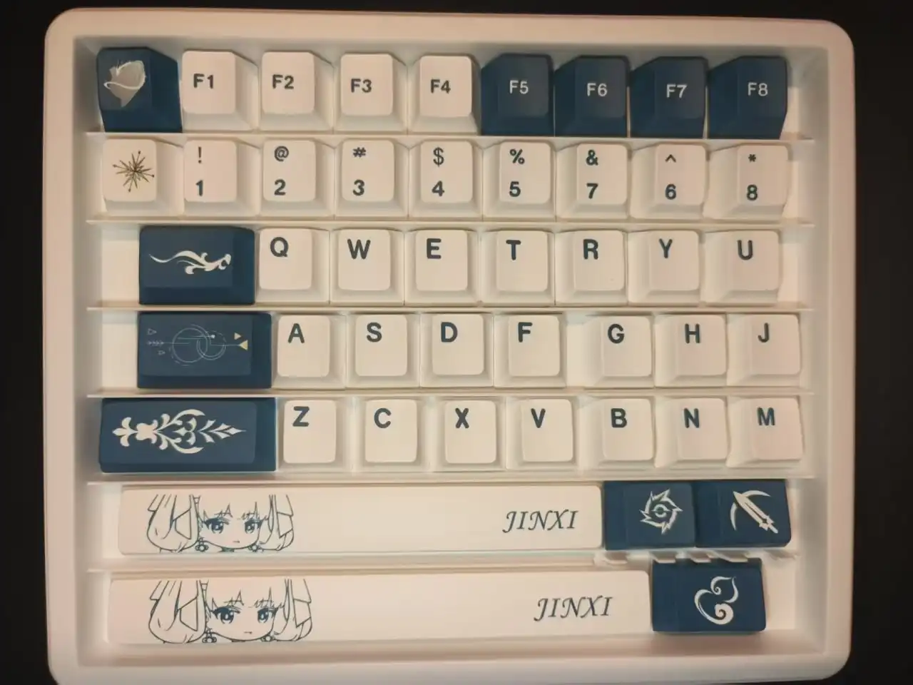 这款键帽的整体配色以青黑色与白色为主,整体风格相对比较简约,并没有特别花里胡哨的图案,但是每一个图案都经过了精心的设计,上面的风格与纹路与今汐的人物形象非常符合。