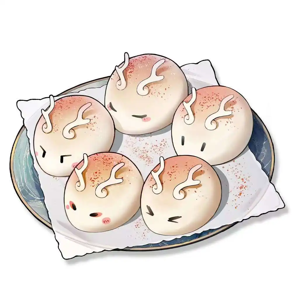 一盘今汐亲手制作的小龙包,粉嘟嘟的小龙包上撒着甜甜的桂花糖粉。这一盘小龙包口味各异,有蛋奶馅儿的、莲蓉馅儿的、豆沙馅儿的………甚至连冰皮的都准备了。
