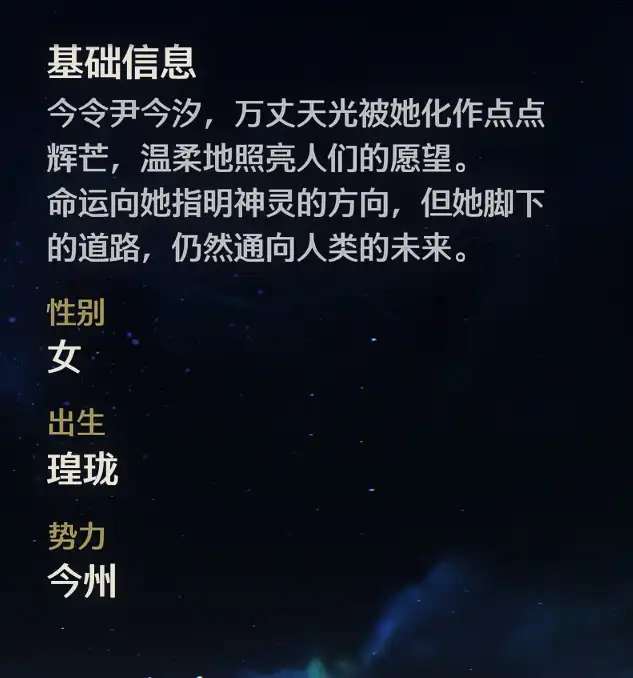 今汐请村民说出自己的愿望。刚开始无人回应,直到一声喷嚏打破寂静,紧接着,一个小小的声音怯生生地哼唧着,想要破除这寒冷。今汐站在人群中央,手捧龙鳞,闭目颔首,示意会向岁主传达你的愿望。霎时,今汐的头上生出龙角,一道形似岁主的光芒划破黑压压的乌云,击穿地上的积雪——霎时间,冰消雪融,寒去春来。众人惊叹:“岁主……岁主显灵了!”龙形天光倒映在人们的眼中,重新点燃了希望的光芒。一传十、十传百,许愿的习俗逐渐风靡今州。大大小小的愿望在边庭附近聚集,传进今汐的耳中。时至今日,许愿已经成为了人们的习惯,成为了人们与令尹之间心照不宣的默契。 在意之人根据今州类书记载,曾经有一位能够肉身吸收残象的英雄,在今州乃至整个瑝珑的历史上留下了浓墨重彩的一笔。而如今,有一位奇异之人即将现世,今汐认为,此人或许与那位英雄有着千丝万缕的联系。