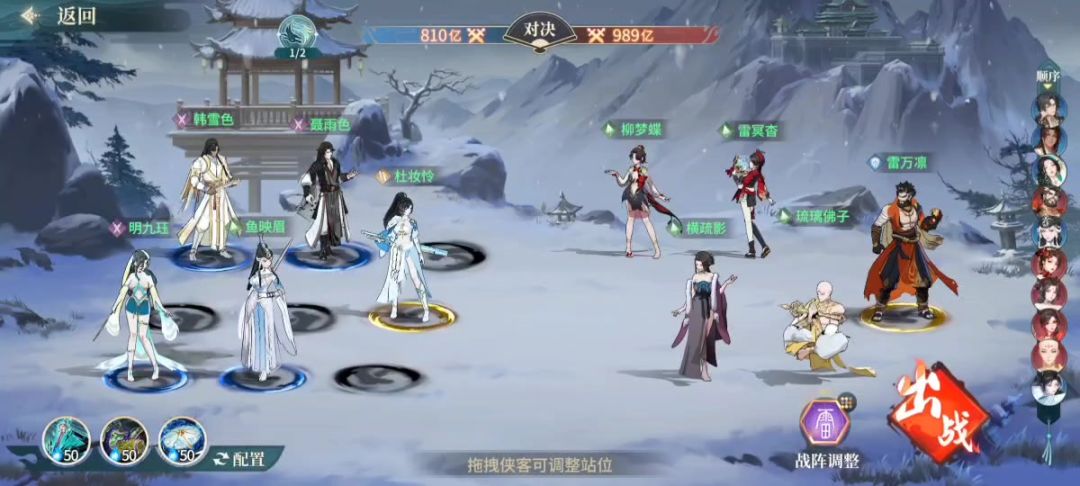 最后分享一个新的配队,鱼肚聂明+柳或者司徒,这个我改版前就试过,但因为当时千里秋毫只有一个单位,而且必须给杜所以效果不理想,改版后允许多c存在,实战下来还是很nice的,器魂离垢起手加天裂和伞,设置顺序释放,比起明九钰单挂优点就是省下来挂件给其他队伍用,且打薄雁君很好用