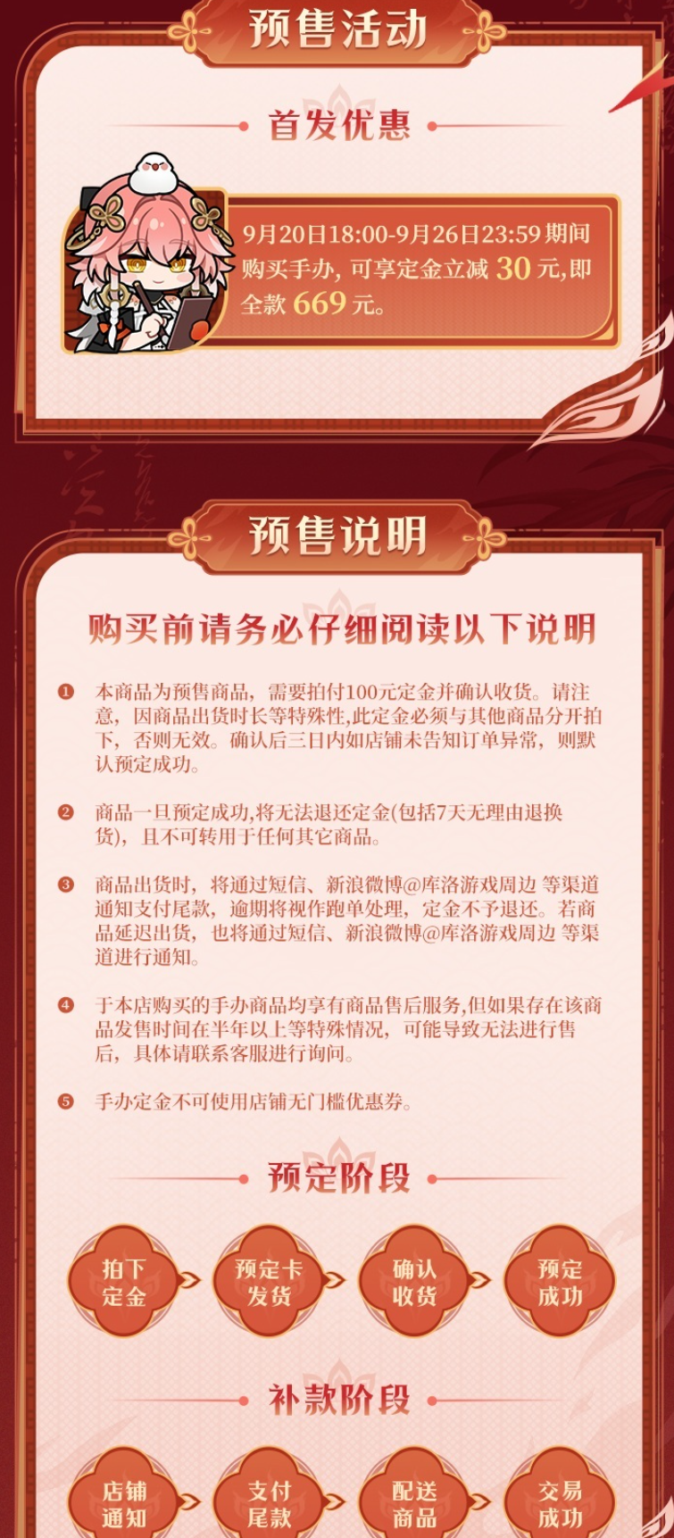 9月20日18:00-9月26日23:59期间购买手办,可享定金立减 30 元,即全款 669 元。