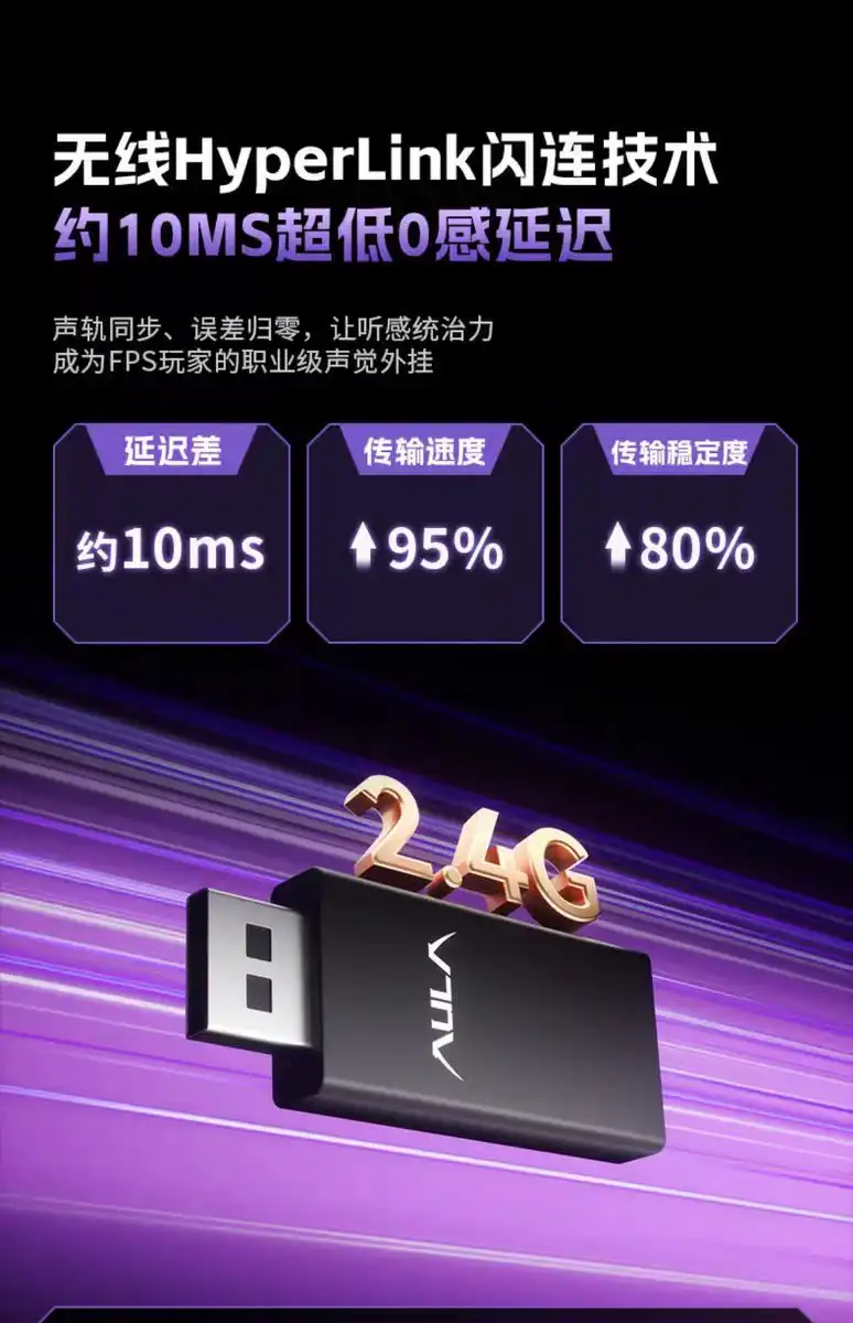 在延迟方面,这款耳机采用了是无线HyperLink闪连技术,说实话这个技术我不知道啥意思,但是这个效果是真的吓人,你说2.4G能达到10ms延迟,要知道,千元价位的无线电竞耳机延迟也基本上都在15ms左右,这找谁说理去?除了延迟低之外,这款耳机的延迟稳定性也是首屈一指,这下谁还分得清你是有线耳机还是无线耳机?