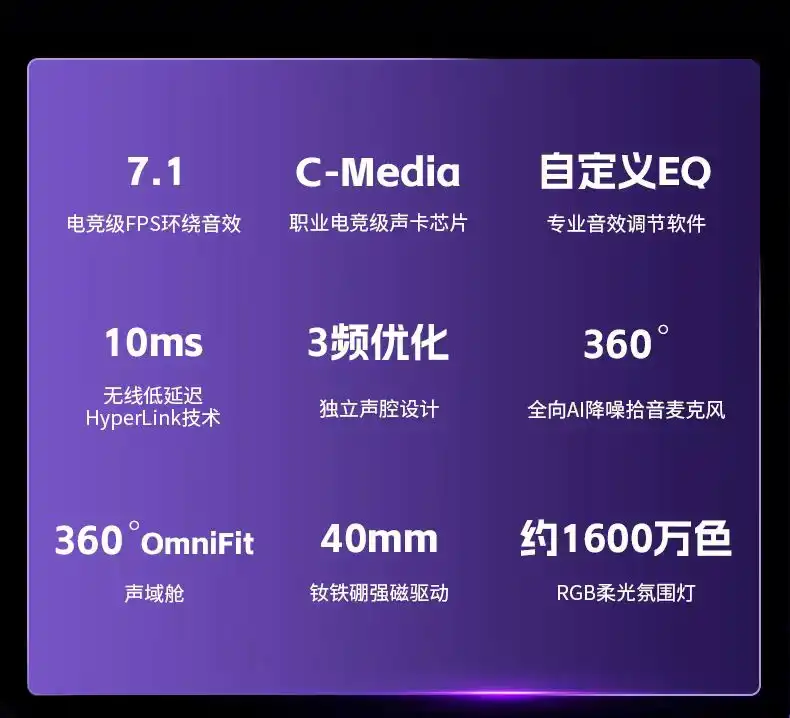 当然,芯片再好,那也得有底子支撑,这款耳机的驱动单元采用的是40mm钕铁硼强磁复合驱动单元,并且在驱动内搭载了职业电竞级环绕7.1虚拟音效,从而大幅度的还原声场的细节,听声辨位以及精准拾音那是信手拈来。