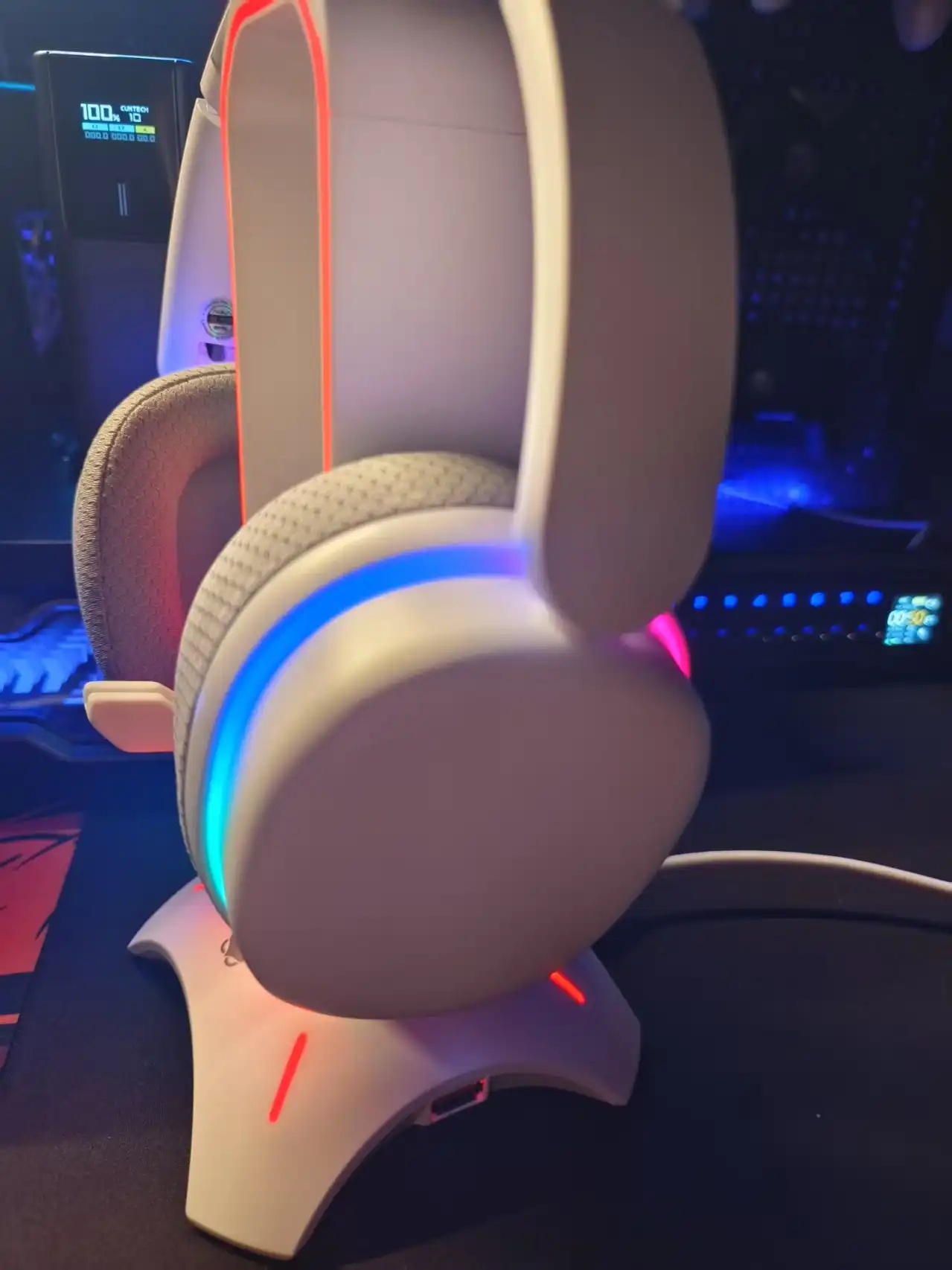耳机一共有绯月粉、银翼白以及赤焰黑三种颜色,经常看我测评的朋友都知道,作为一个猛男,那必须狠狠支持猛男粉!如果你以为这款我也有推荐粉色,那可就大错特错了!你外设有一款粉色叫猛男粉,两款叫真猛男粉,三款叫极限猛男粉,你要是四个外设全是粉色,那被指认成南梁跳进黄河也洗不清了。因此,我果断推荐更有韵味的白色。(其实更想要紫色,她说紫色更有韵味,白色也不是不行)。