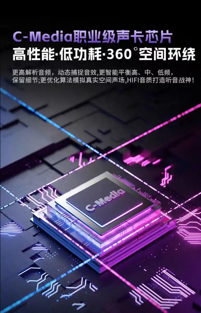 聊完外观,接下来该聊一下性能方面了。耳机的芯片采用的是职业电竞级C-Media芯片,作为高端芯片的代表,更是受到了诸如华硕等多家知名品牌的青睐,相较于传统的芯片,这款芯片拥有更高的解析力,功耗也大幅度降低,对于低中高频都能起到单独的优化效果,同时优化了模拟真实空间声厂,从而让音质更上一层楼。