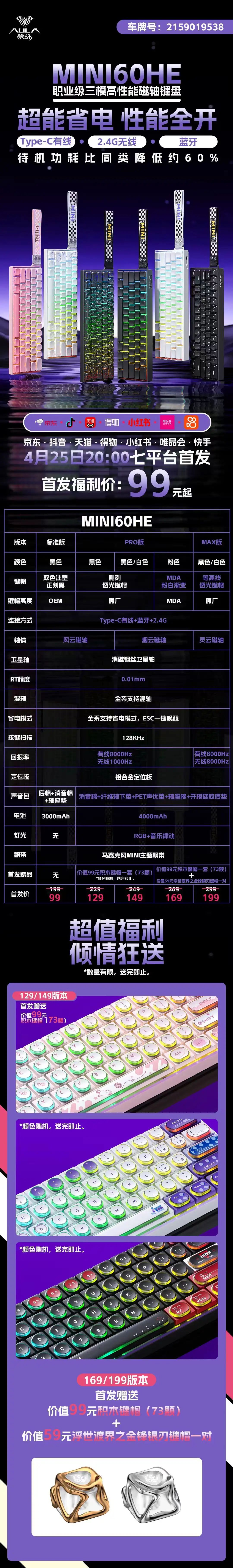 狼蛛终于正式公布了全新三模磁轴键盘MINI60HE,并且将于4月25日七普通同步发售,首发福利价仅售99元,首发购买129/149版本还额外赠送价值99元的积木键帽,169/199版本除了赠送键帽之外,还附赠价值59元浮世液界之全终银刀继帽一对。相当于不到二百元的价位可以买到三百多的产品,性价比直接拉满。