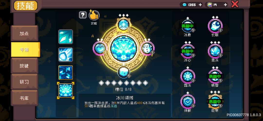冰川领域极寒专精进一步提升伤害 唤雪专精可以稳定给怪物挂上易伤以及提升冰冷伤害 (我这里带冰敷是为了挂专注buff 冰心是为了增加决心的持续时间 刷图更加丝滑)追求伤害可以换成长眠和霜冻