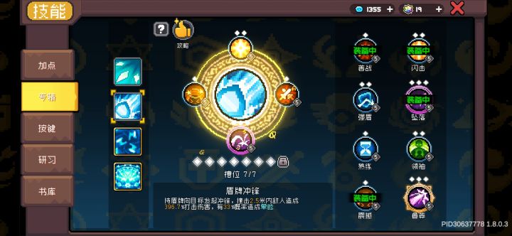 专精方面 守卫的盾击带的是坠落善战闪击和震撼 坠落加闪击可以更快的释放跳打从而触发冰川 善战可以让守卫长期维持全体伤害的加成 震撼的眩晕可以让决心叠的更快