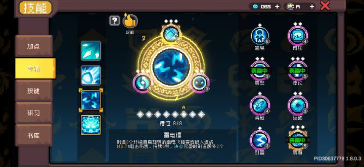 首先加点方面 因为冰川的专精会把伤害转化为冰属性伤害 所以这里是把风暴破碎和冰霜之盾点满 舍弃了闪电之矛 由于风暴守卫是近战职业 带引力的情况下怪物贴脸会非常疼 有需求可以点满护盾 如果不需要太多生存的话可以把加点给光环和雷霆决心提升伤害