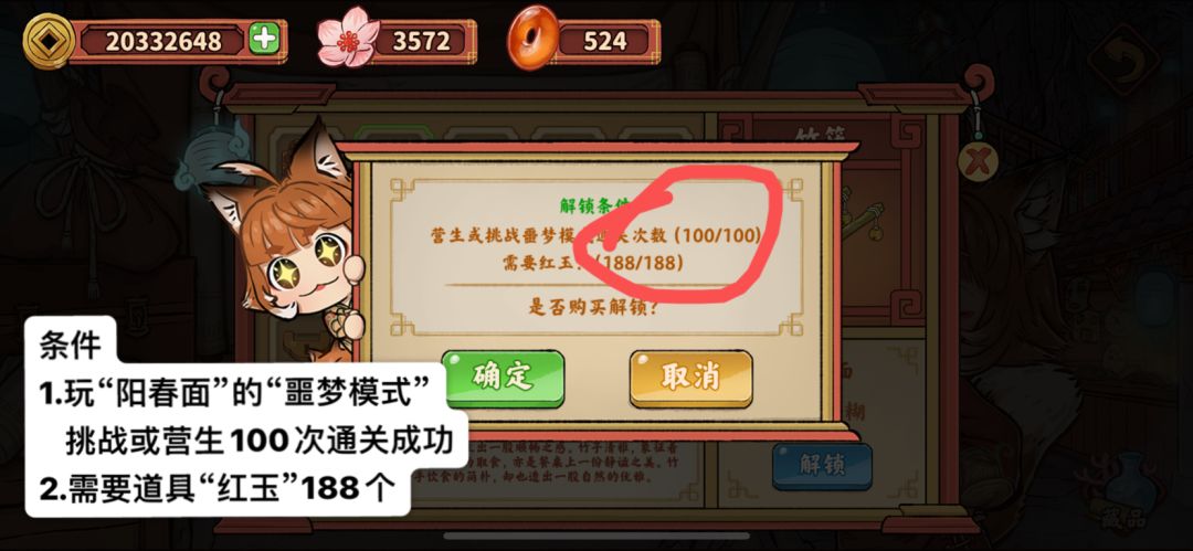 2.需要条件:1.第1-3章每章通关100次营生或挑战的噩梦模式。2.红玉188个(很费的道具,希望官方能多爆点红玉也行,对新手不太友好)