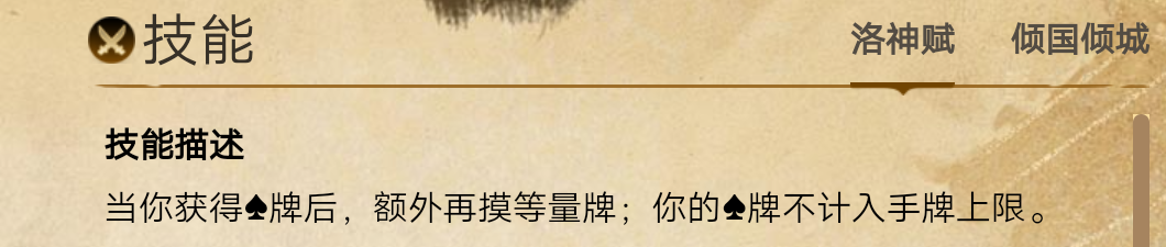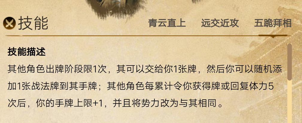 苏秦给自己用合纵强化2次牌,孙权不触发“乘马射虎”技能;给甘宁强化水牌时,也不触发“百人射虎”技能;给甄姬强化水牌时,与甘宁一样不触发“洛神赋”技能;给范雎连续强化5次牌时,也不触发“五跪为相”加手牌上限效果。