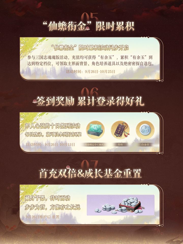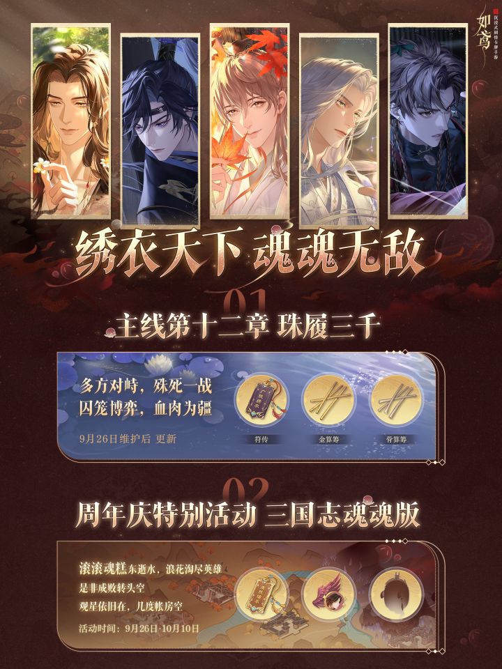 9月26日,如鸢周年庆限时活动“三国志魂魂版”正式上线,主线更新、密探魂魂乐等活动同步上线。以下是本次周年庆系列活动预告,请殿下查阅——