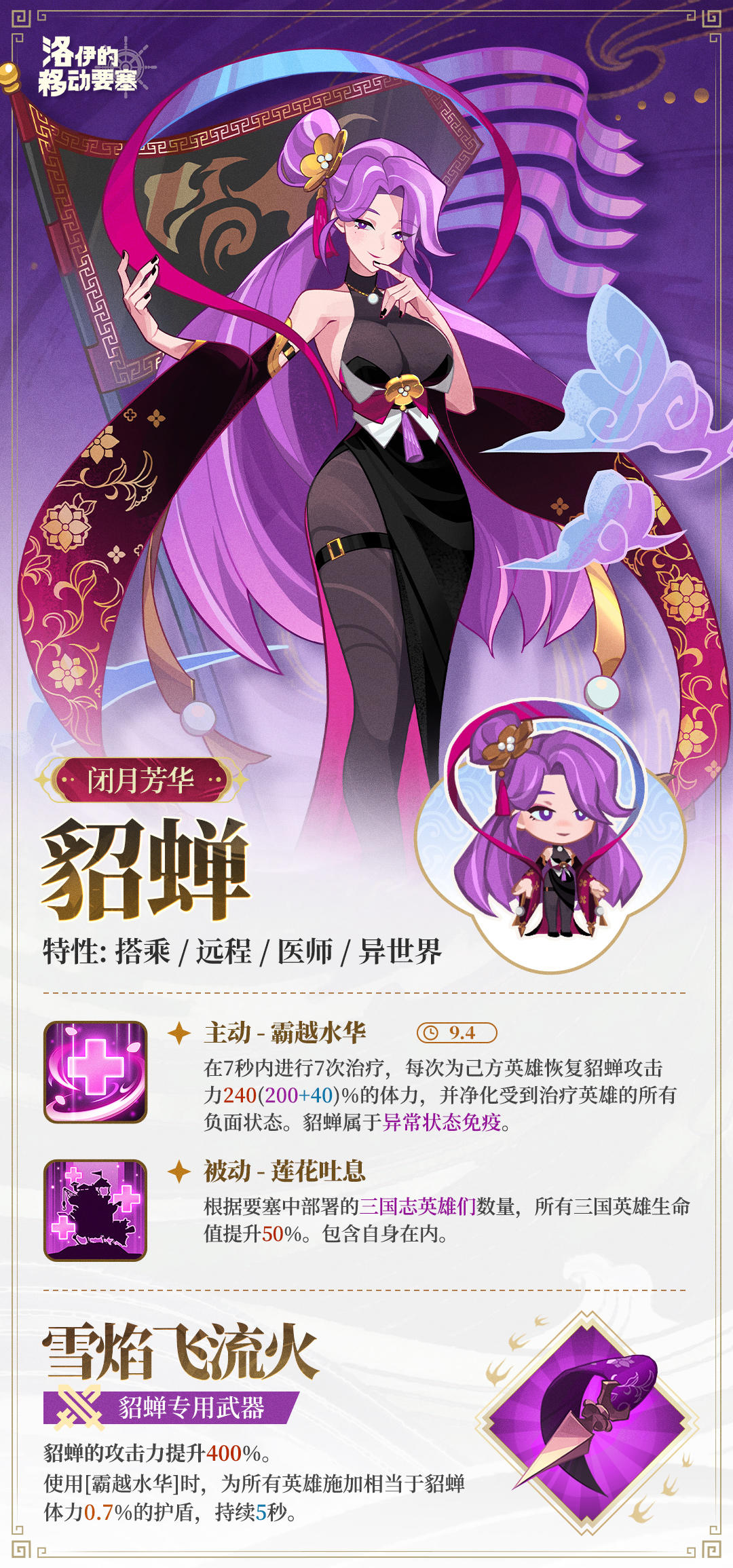 一位倾国倾城的女子,兼具绝世美貌、过人谋略与悲壮决断。为诛灭董卓,她周旋于吕布身侧。虽被吕布赤诚之情所动摇,仍为大义忍痛牺牲自我。那温柔笑靥下隐藏的坚毅与哀伤,终使她成为真正的英雄。貂蝉所经之处,暗香浮动,久久不散。