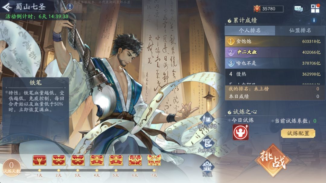 今天继续大家简单更新——蜀山七圣——铁笔的试炼特性