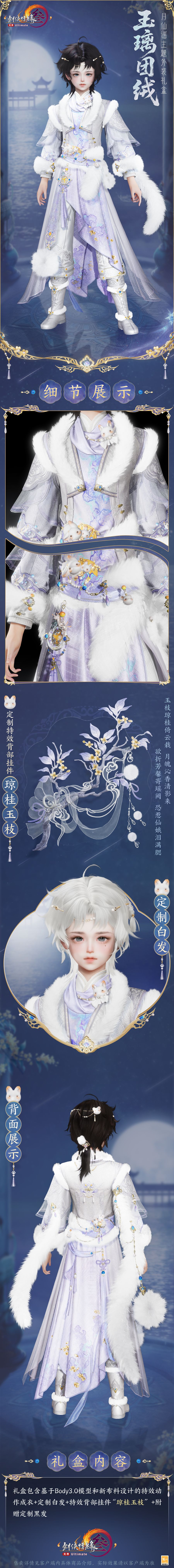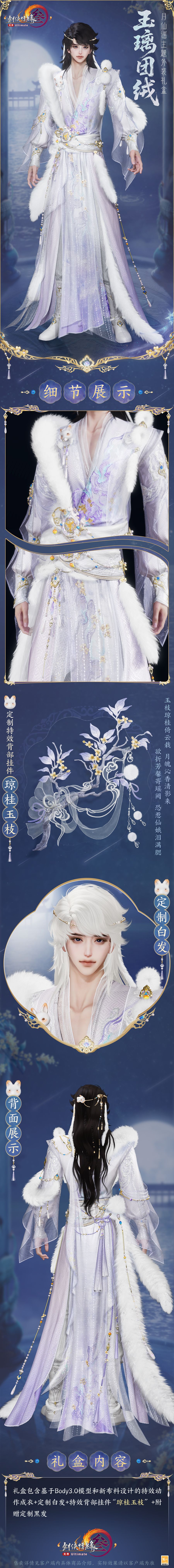 礼盒内含特效背部挂件“琼桂玉枝”十足精巧,玉质凝脂似承露,携之如带秋夜桂庭清韵。使用特效后侠士将手持桂枝静立于明月幽夜处,遍散暗香馥郁。