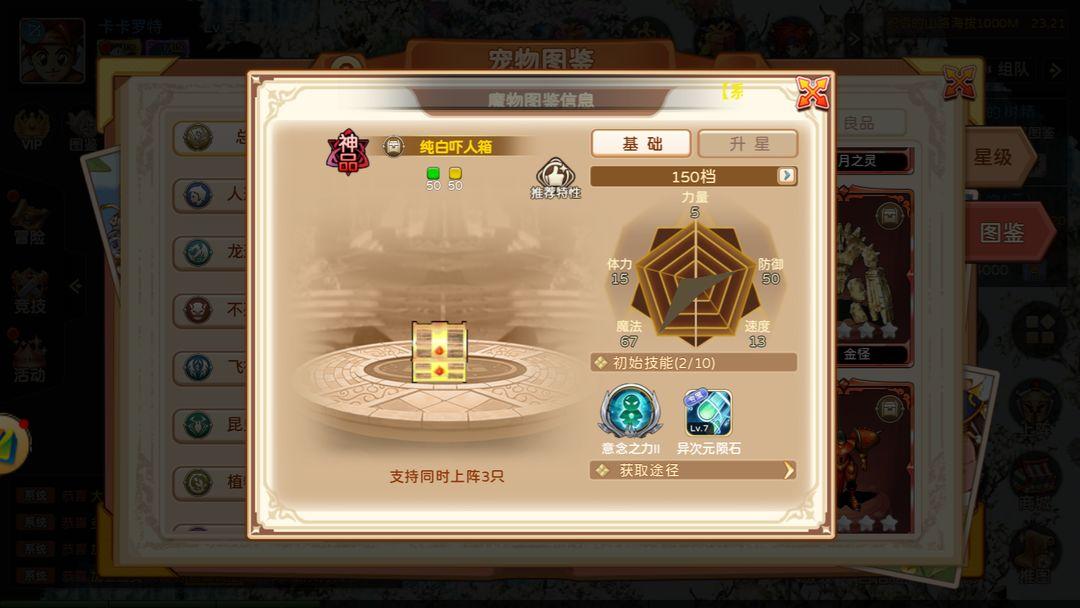 宠物如何获取?其中珍品、上品、良品是我们可以轻松获得的;而极品是需要完成任务、推图才能获取,王品则是推图获得宝箱有概率得还有vip、活动获得;神品开vip和活动获取,也是所有宠物中价值最高的一个(如果是欧皇玩家当我没说);手游目前的神宠一共有34只(后续会不会再出,目前还不清楚):其中纯白吓人箱,这个神品宠物开通vip4即可获取,其他神品宠物获取还未出现。