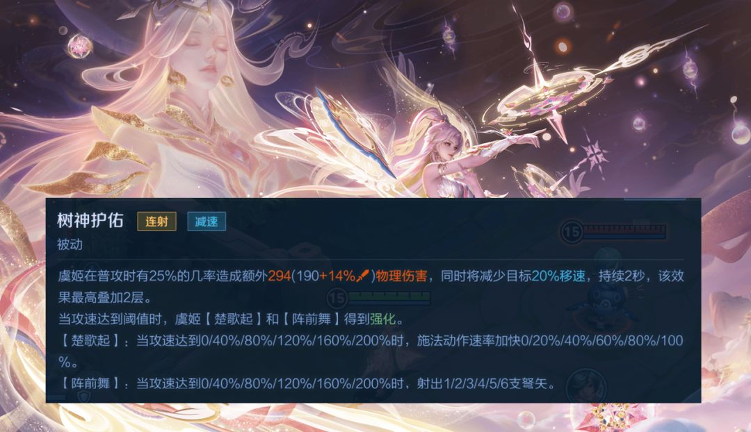 虞姬的被动技能可以让她有几率释放二连射,并且攻速到达一定值时会强化1技能和大招,提高1技能的释放速度,增加大招的箭矢数量,是一个强化技能。