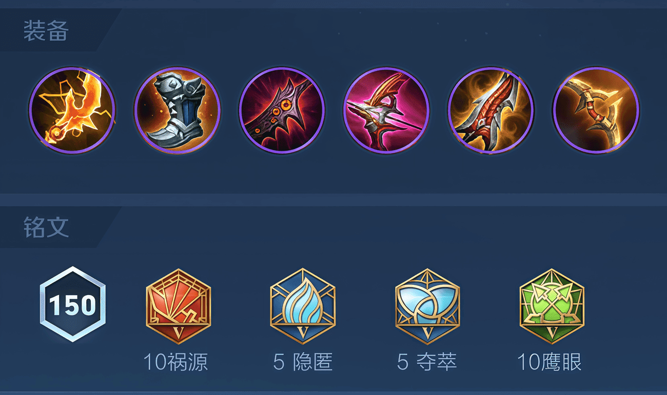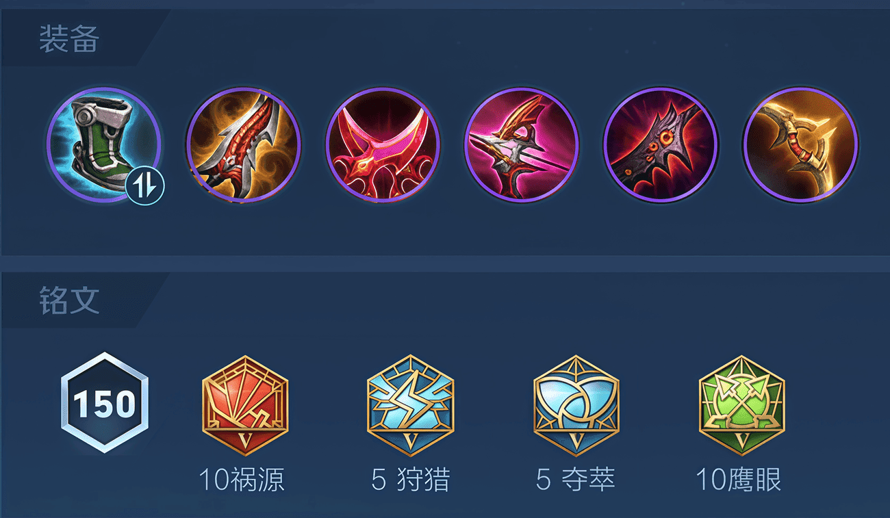 一套攻速暴击流,出装:急速战靴(抵抗之靴)、无尽战刃、影刃、破晓、末世/制裁之刃、逐日之弓,铭文:10祸源、5隐匿5夺萃、10鹰眼。
