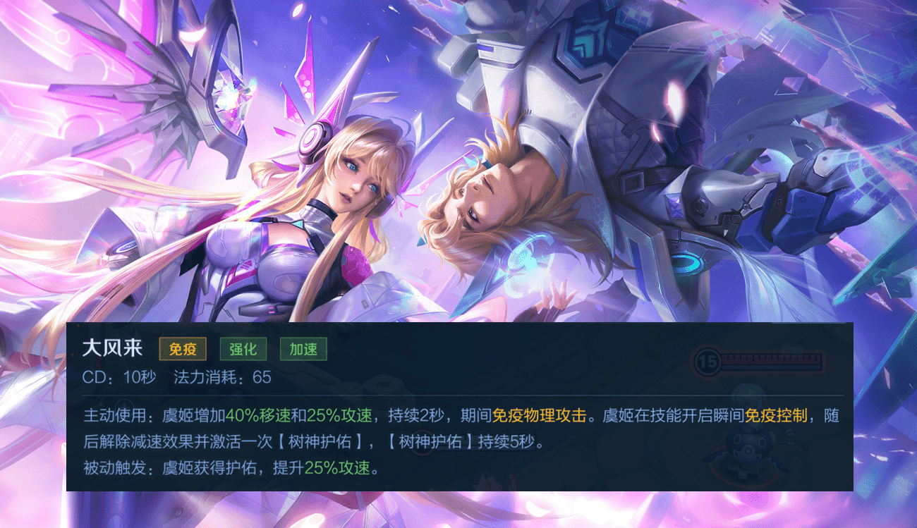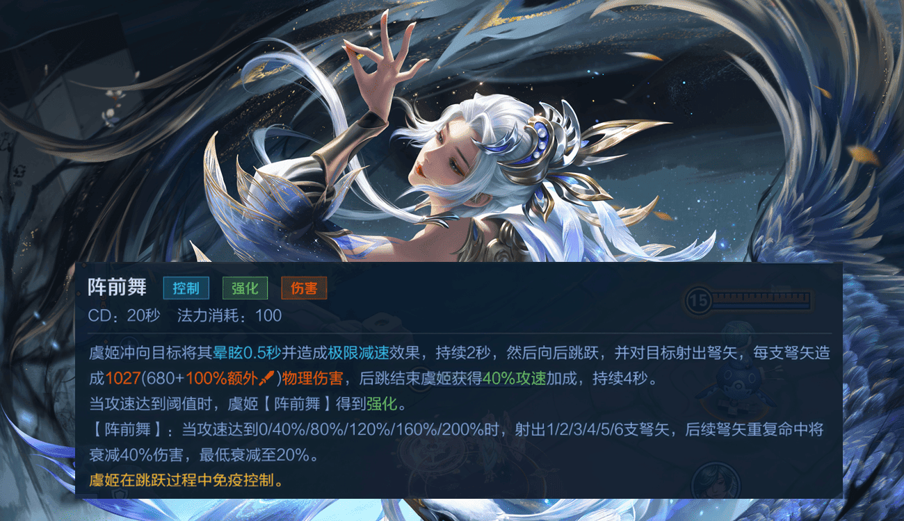 虞姬的大招兼具保命和强化能力,在释放大招后,虞姬会冲向目标,对目标造成晕眩和减速效果,然后在向后跳跃,跳跃过程免疫控制,落地后获得攻速加成。