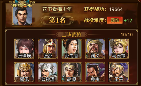 本期江夏之战中赢得第三位的是 龙骧・楚穆王 军团,以 19664 的优异战功位居第三,恭喜!