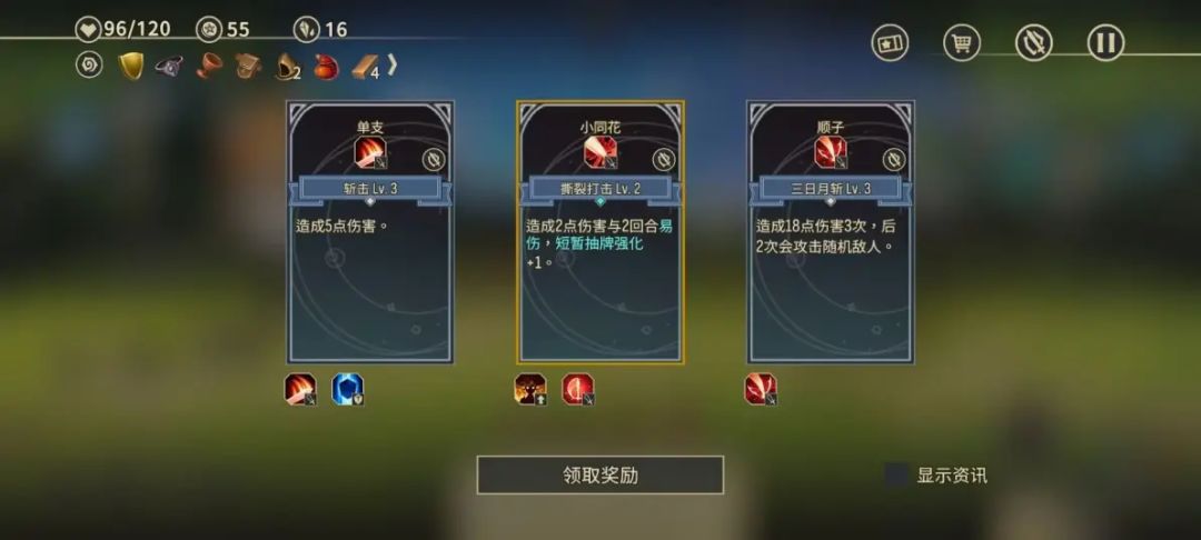 - 在完成战斗过后,玩家能够获得资源奖励,包括技能,道具和装备。每次获得资源奖励,玩家都需要从三个选项中选择一项。