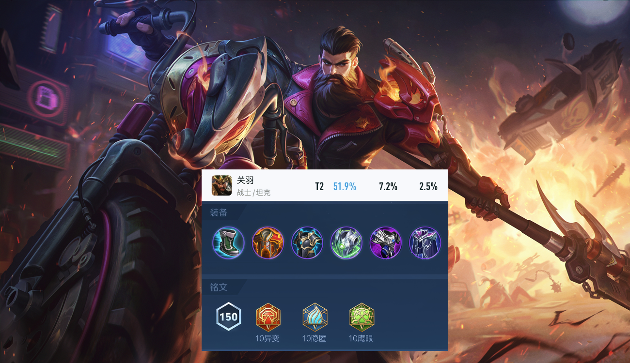 关羽虽然在所有段位的胜率只有49.1%,但顶端排位有51.9%,开发出来的肉装,抵抗之靴、红莲斗篷、冰霜冲击、永夜守护、霸者重装、魔女斗篷,因为被动的能量回复,1技能和大招都有生命值百分比加成,这套出装既有伤害又有坦度,就算被打断马腿,有坦度在身,也不容易被秒掉,大大提高了容错率。