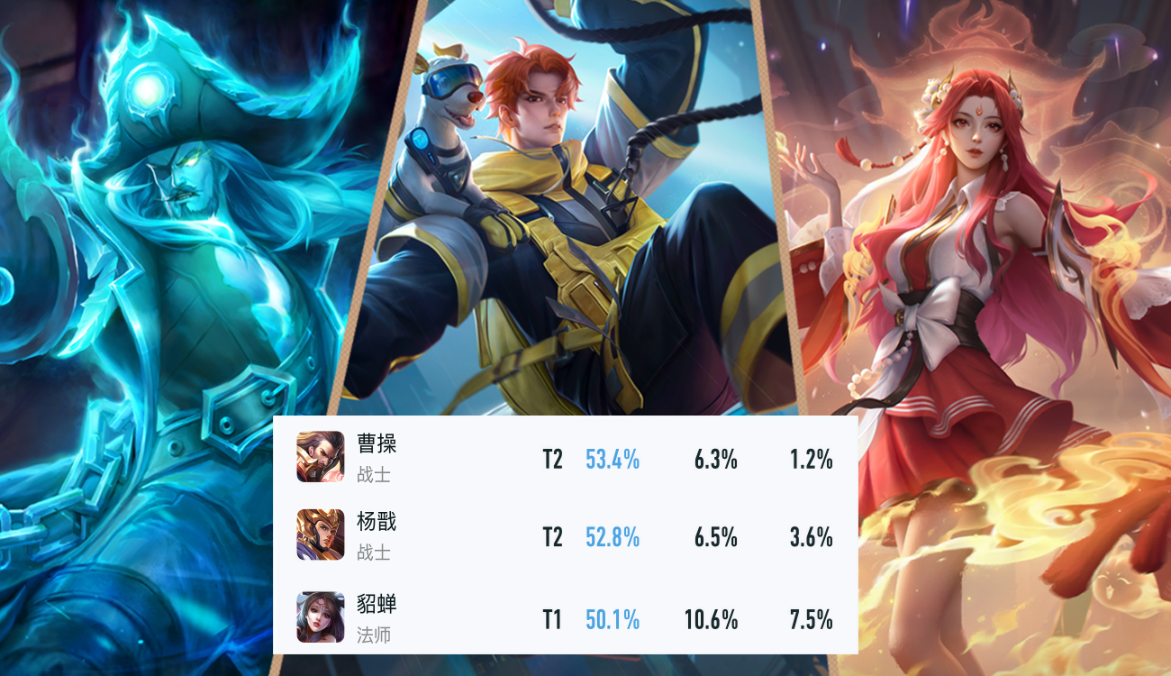 杨戬和曹操更不用多说,52.8%、53.4%的胜率直接登顶对抗路,其中杨戬的狗子突进,大招的回复,2技能的真伤,被动的霸体,真的做到了七进七出。