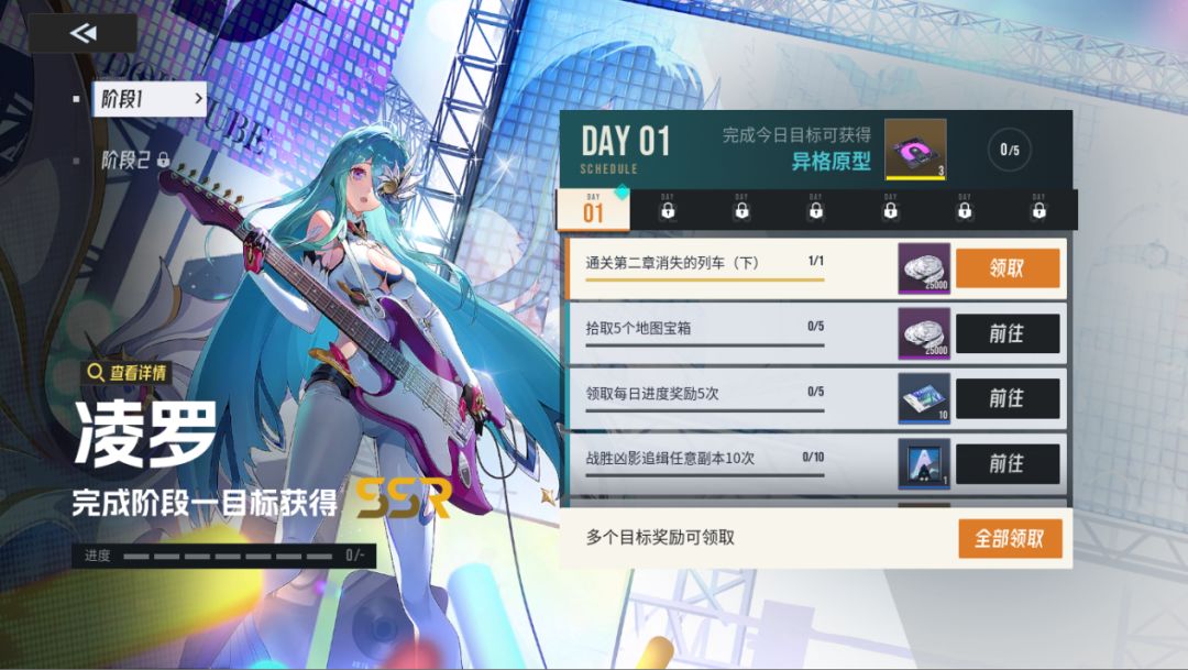 ■完成全部第一阶段7日目标任务,可获得SSR异格者「凌罗」、完美晶格、留影·赤以及大量养成材料。