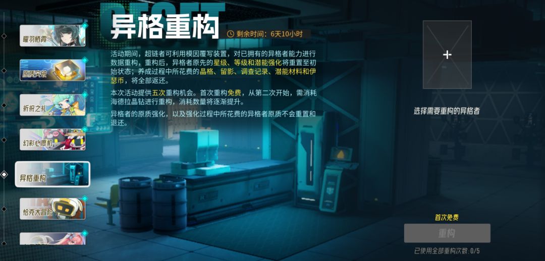 ■活动期间,可选择需要重构的异格者,将已有的星级、等级和潜能强化重置至初始状态;养成过程中所花费的晶格、留影、调查记录、潜能材料和伊瑟币,将全部返还。