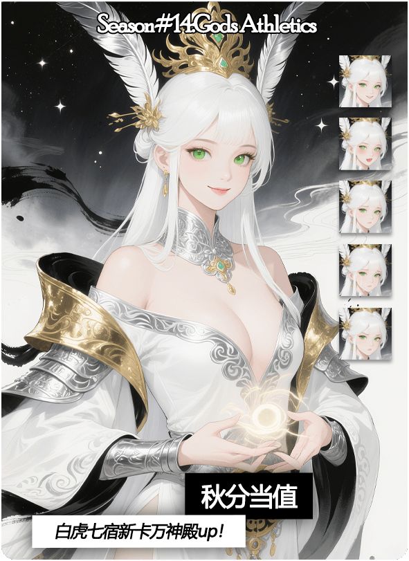 注:本次7张新卡的合成资源为“白虎精华”,白虎精华可通过礼包购买或“万神之星和万神殿”卡池抽取,也可在“白虎兑换”处使用橙色/扬升精华进行兑换。